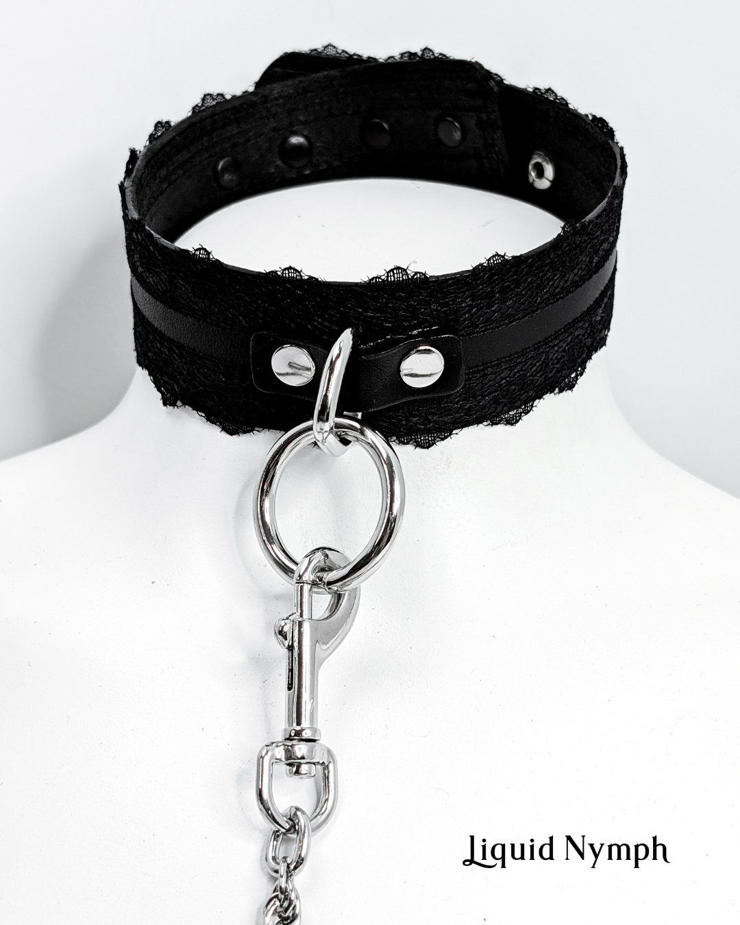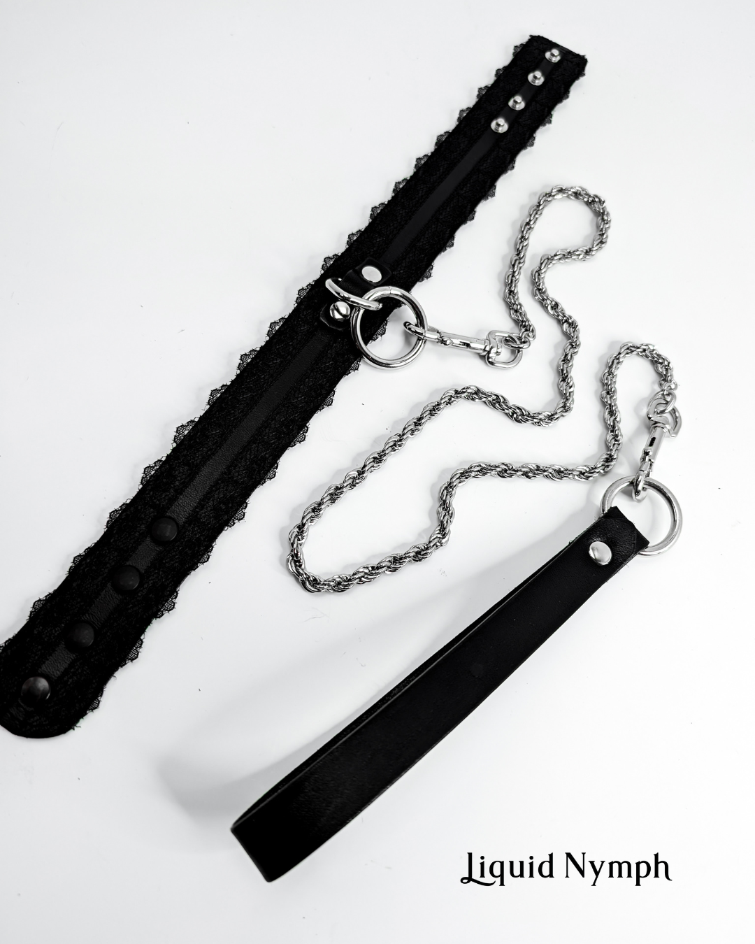 Classic BDSM Collar Cuff & Leash Set with a ladylike flair. Strong belt-weight leather with lovely lace machine stitched in place.